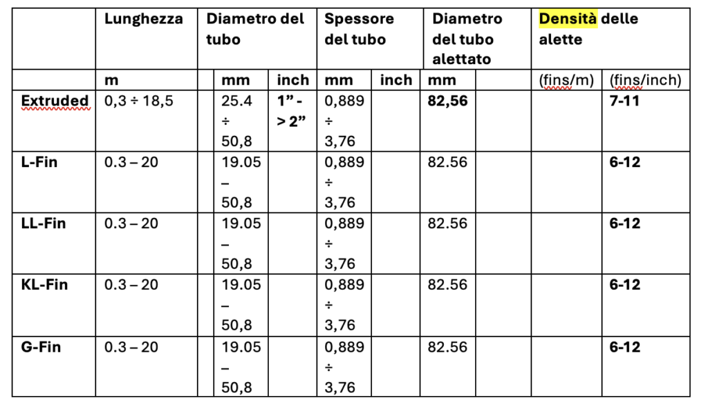 I tubi con alte alette integrate sono realizzati con un nucleo metallico che può variare da: